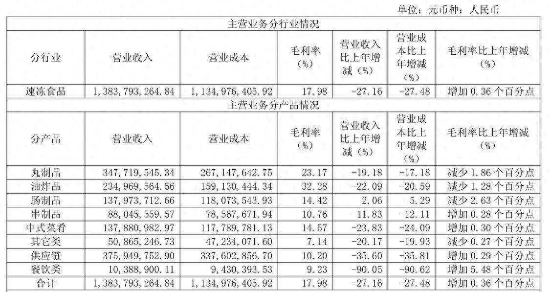 2025年,惠发食品主营业务分产品情况。公告截图