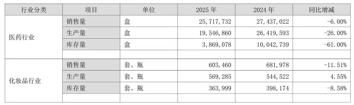 分行业来看,2025年,益盛药业医药板块销售量同比下滑6%,生产量同比下滑26%;化妆品销售量同比下滑11.51%,生产量同比增加4.55%。